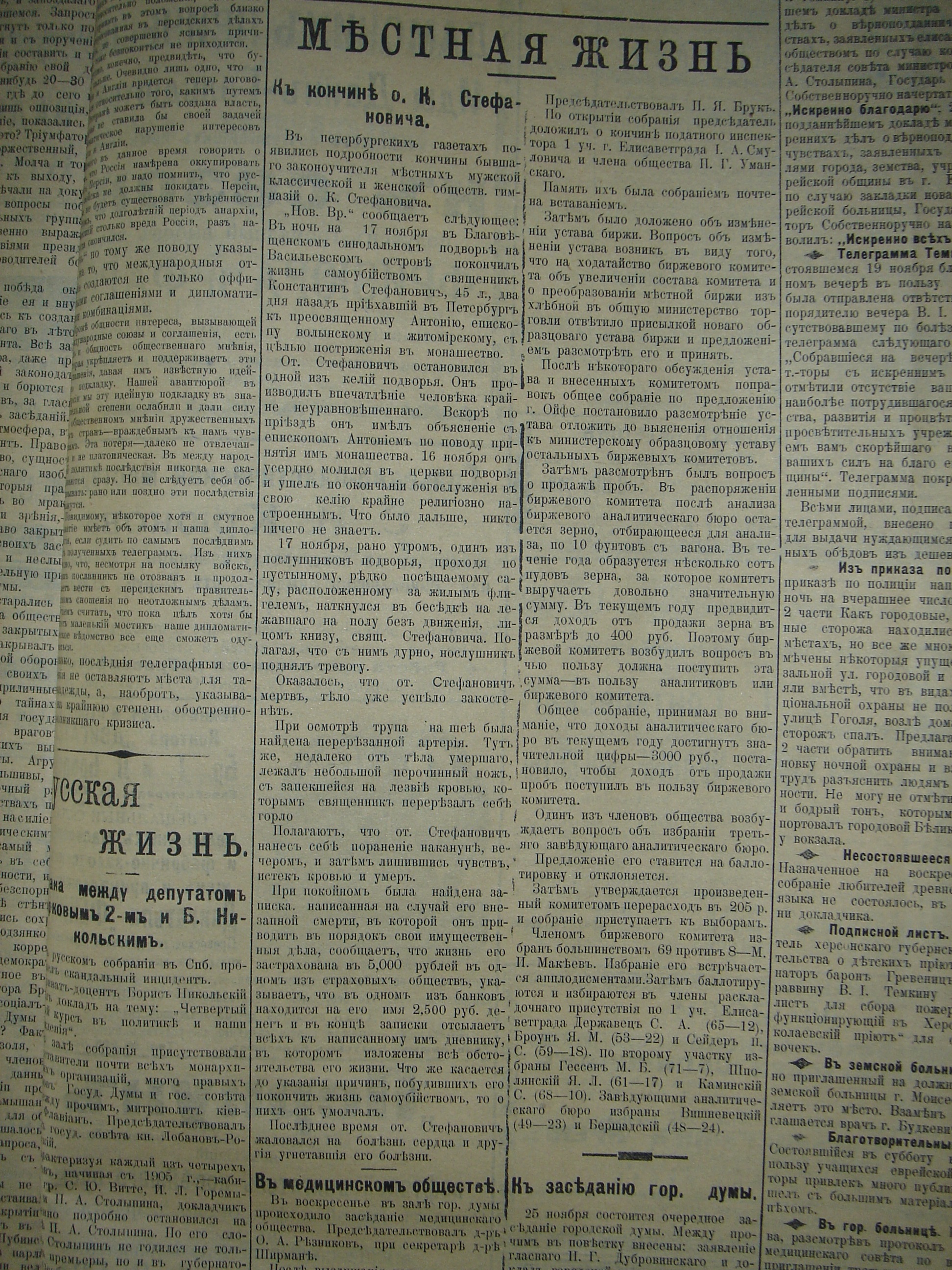 В петербургских газетах появились подробности кончины бывшего законоучителя местных мужской классической и женской обществ. гимназий о. К. Стефановича. „Нов. Вр." сообщает следующее: В ночь на 17 ноября в Благовещенском синодальном подворье на Васильевском острове покончил жизнь самоубийством священник Константин Стефанович, 45 лет, два дня назад приехавший в Петербург к преосвящонному Антонию, епископу волынскому и житомирскому, с целью пострижония в монашество. От. Стефанович остановился в одной из келий подворья. Он производил впечатление человека крайне ноуравновешенного. Вскоре по призде он, имел объяснение с епископом Антонием по поводу принятия им монашества. 16 ноября он усердно малился в церкви подворья и ушел по окончании богослужения в свою келию крайне религиозно настроенный. Что было дальше, никто ничего не знает. 17 ноября, рано утром, один из послушников подворья, проходя по пустынному, редко посещаемому саду, расположенному за жилым флигилем, наткнулся в беседке на лежавшего на полу без движения, лицом книзу, свящ. Стефановича. Полагая, что с ним дурно, послушник поднял тревогу. Оказалось, что отец Стефанович мёртв, тело уже успело закостенеть. При осмотре трупа на шее была найдена поререзанной артерия. Тут же, недалеко от тела умершего, лежал небольшой перочинный нож, с запекшейся на лезвие кровью, которым священник перерезал себе горло. Полагают, что отец Стефанович нанёс себе поранение накануне, вечером, а затем лишившись чувств, истёк кровью и умер. При покойном была найдена записка, написанная на случай его внезапной смерти, в которой он приводит в порядок свои имущественные дела, сообщает, что жизнь его застрахована в 5,000 рублей в одном из страховых обществ, указывает, что в одном из банков находится на его имя 2.500 руб. денег и в конце записки отсылает всех к написанному им дневнику, в котором изложены все обстоятельства его жизни. Что же касается до указания причин, побудивших его покончить жизнь самоубийством, то о них он умолчал. Последнее время от. Стефанович жаловался на болезнь сердца и другие угнетавшие его болезни.
