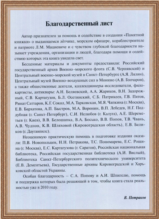 Книга Виктора Петракова посвящена памяти одного из первых российских лётчиков, талантливого морского инженера и украинского общественного деятеля капитана Льва Мациевича (1877—1910). В издании использованы иллюстрации, тексты и документы из «Сборника памяти Л.М. Мациевича» (СПб., 1912 г.), давно уже ставшего библиографической редкостью, материалы из коллекции и архива автора, из очерка Владимира Панченко «Небо Левка Мацієвича» (Київ, Пульсари, 2009 г.), Александровского районного краеведческого музея. Центрального музея Военно-воздушных сил, Российского государственного архива Военно-Морского Флота и других источников.